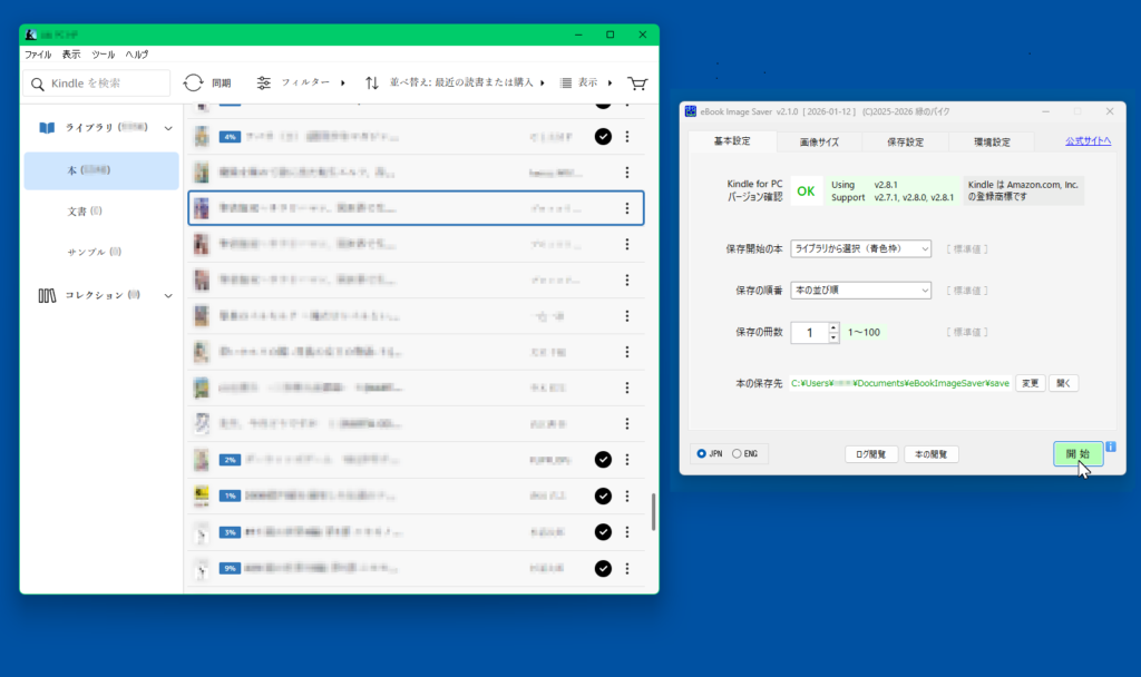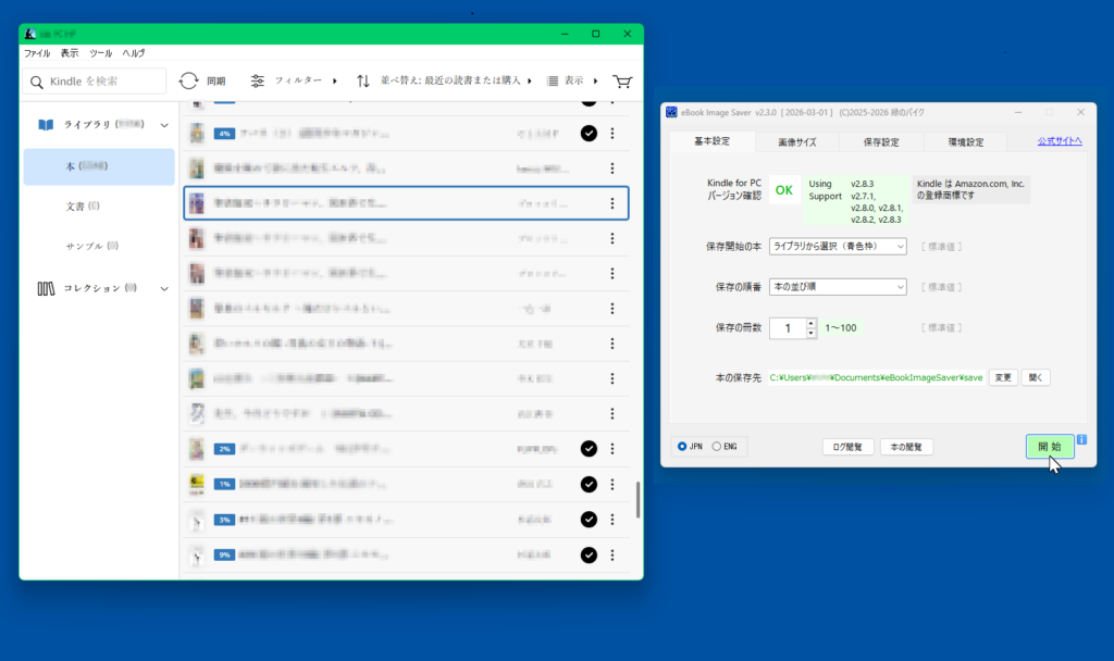 基本操作は、Kindle を開き、ライブラリ一覧から保存したい本をクリックし(選択を示す青色の枠が表示される)、本アプリの「開始」ボタンを押すだけです。